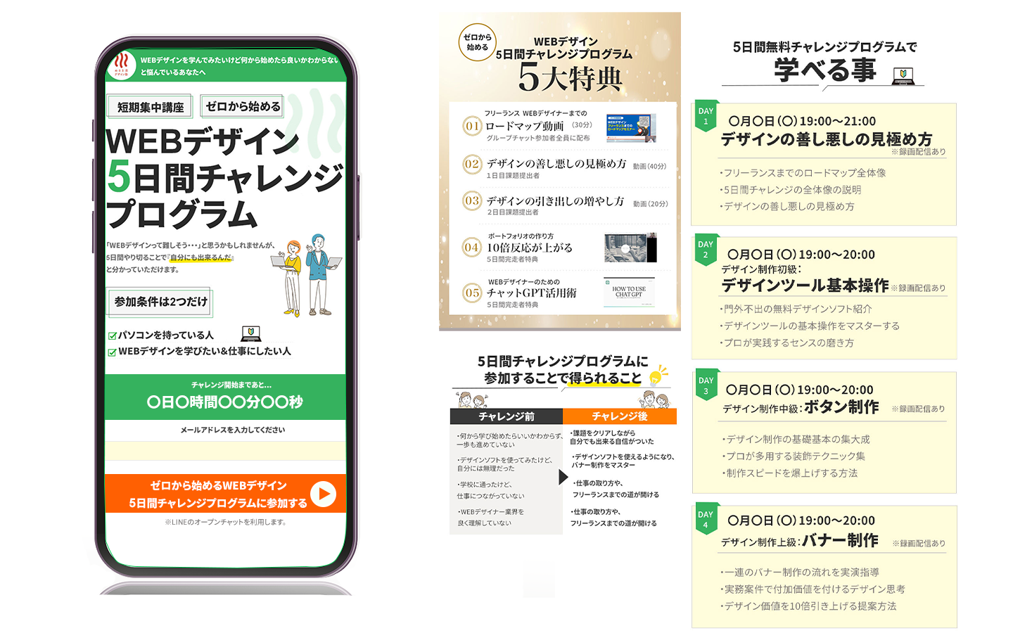 LP制作 WEBデザインスクール5日間チャレンジ案内 2026年1月14日 最終更新日時 : 2026年1月14日 chiharu oda ・目的 無料のWEBデザイン5日間チャレンジに参加してもらい、参加後には講座の案内を行う・ターゲット 40代前半 男:女=3:7 WEBデザインに興味がある人 在宅で働ける仕事を探している人 ・制作範囲 デザイン制作 実装・制作ツール Photoshop WordPress・工夫ポイント ターゲットとなる方にしっかりと伝わるように、訴求部分が目立つデザインにしました。明るく、信頼感が持てるような色合いも 意識しました。適宜イラストも使用し、和めるような雰囲気のデザインにしました。 \ 最新情報をチェック /
