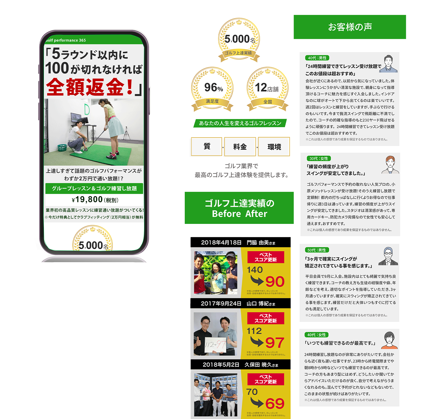 LP制作 ゴルフスクールレッスン案内 2026年1月13日 最終更新日時 : 2026年2月19日 chiharu oda ・目的 新規での顧客獲得 ・ターゲット 50〜60代男性ゴルファー向け ・制作範囲 デザイン制作・制作ツール Photoshop[工夫ポイント]訴求部分を目立たせ、伝えたいことがしっかりと伝わるように制作しました。色合いも統一感を持たせ、信頼感を持たせるためにメダルのあしらいを使用するなどしました。実際のレッスンの様子を見せることで信頼感を得られるようにデザインしました。 \ 最新情報をチェック /